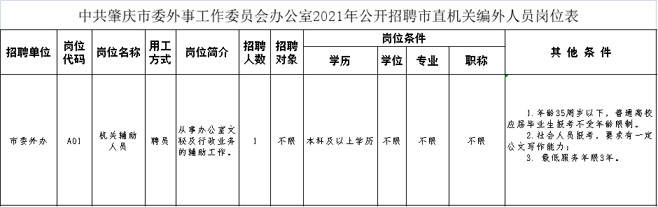 (1)《中共肇慶市委外事工作委員會(huì)辦公室公開(kāi)招聘市直機(jī)關(guān)編外人員報(bào)名表》(一式一份,見(jiàn)附件2,可在“肇慶外事”微信公眾號(hào)下載);