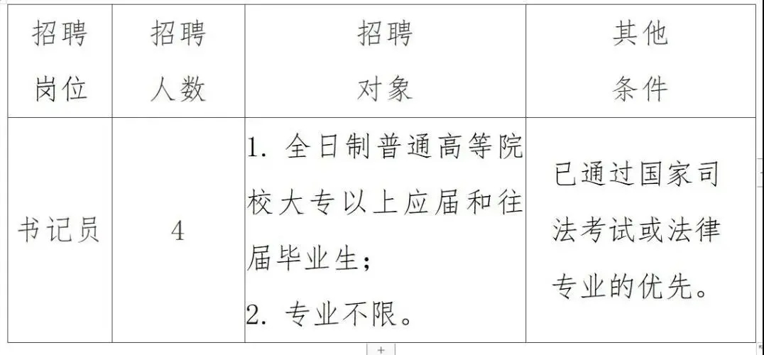 書(shū)記員招聘對(duì)象為全日制普通高等院校大專以上學(xué)歷的應(yīng)、往屆畢業(yè)生,在2021年7月30日以前已經(jīng)取得畢業(yè)證。