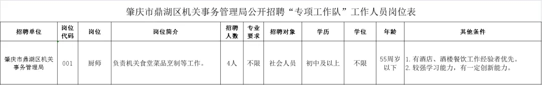 2、報名要求:本次招聘實(shí)行現(xiàn)場報名,有意者請攜帶《報名登記表》(附件2)(一式兩份)、《肇慶市“一員一檔”登記卡》(附件3)、個人近期1寸免冠彩色照片3張,有效二代身份證、畢業(yè)證書、學(xué)位證書(原件及復(fù)印件),一并交至肇慶市鼎湖區(qū)機(jī)關(guān)事務(wù)管理局辦公室,報名地點(diǎn):肇慶市鼎湖區(qū)坑口街道鼎湖區(qū)人民政府大院內(nèi)一樓書吧;