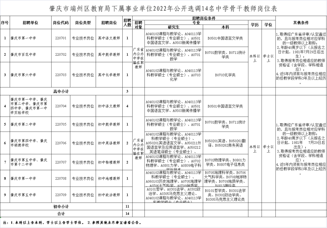 (2)把填寫好的《肇慶市端州區(qū)教育局下屬事業(yè)單位關于2022年公開選調中學骨干教師考試報名人員名單匯總表》(見附件2)電子版于2022年8月12日24:00發(fā)送至郵箱zqdz2279344@163.com。逾期不接受報名。